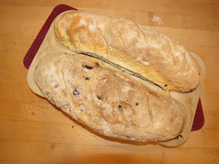 This morning, here are the loaves. One is loaded with kalamata olives. The only real problem I had with the entire process is it calls for regular flour and not whole wheat flour. So I actually purchased some unbleached, (I never could understand Clorox in flour), all purpose flour just for this bread.